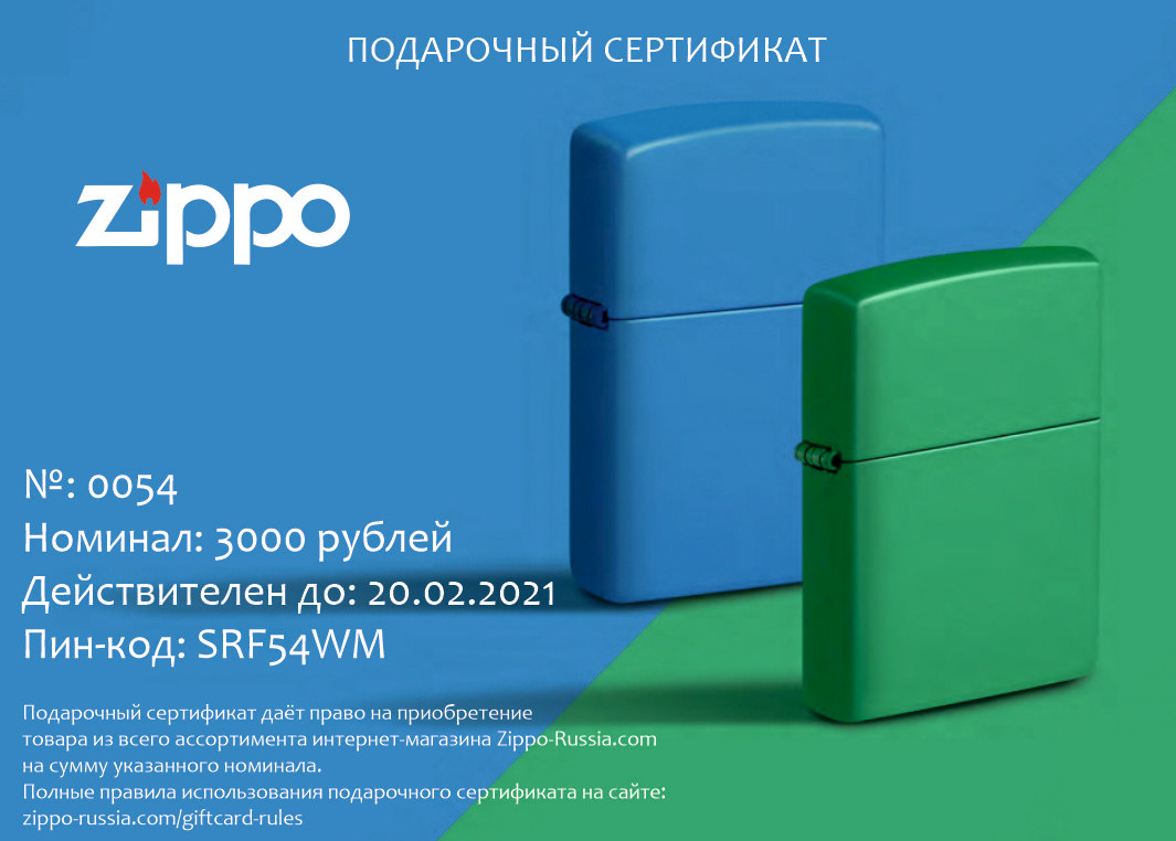 Подарочный сертификат Zippo 5000 от официального дилера Zippo в Мурманске. Вы можете дополнительно заказать гравировку, которая подчеркнет Вашу оригинальность и придаст памятность статусному подарку.